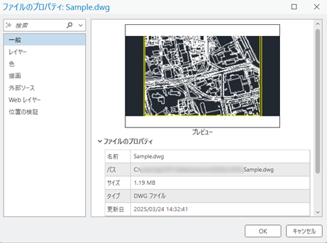 これらのファイルのうち CAD データセットの方は、ArcGIS Pro において 1 つのグループ レイヤーとして扱われ、マップに追加すると、CAD ソフト上で表示されていた図面が編集不可の表示専用の図面として表示されます。また、[カタログ] ウィンドウや [カタログ] ビューからプロパティを確認すると図面をプレビューすることもできます。