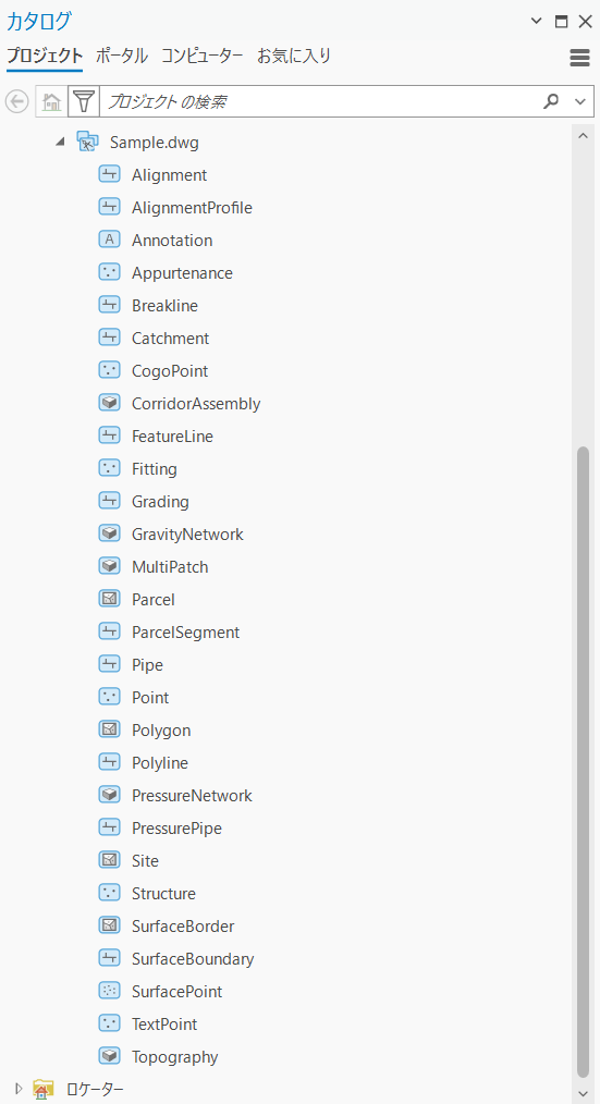ArcGIS Pro では、DWG や DXF などの CAD ファイルをそのままマップやシーン上に追加できます。その時、ArcGIS Pro の [カタログ] ウィンドウ上などでは、以下のように表示されます。