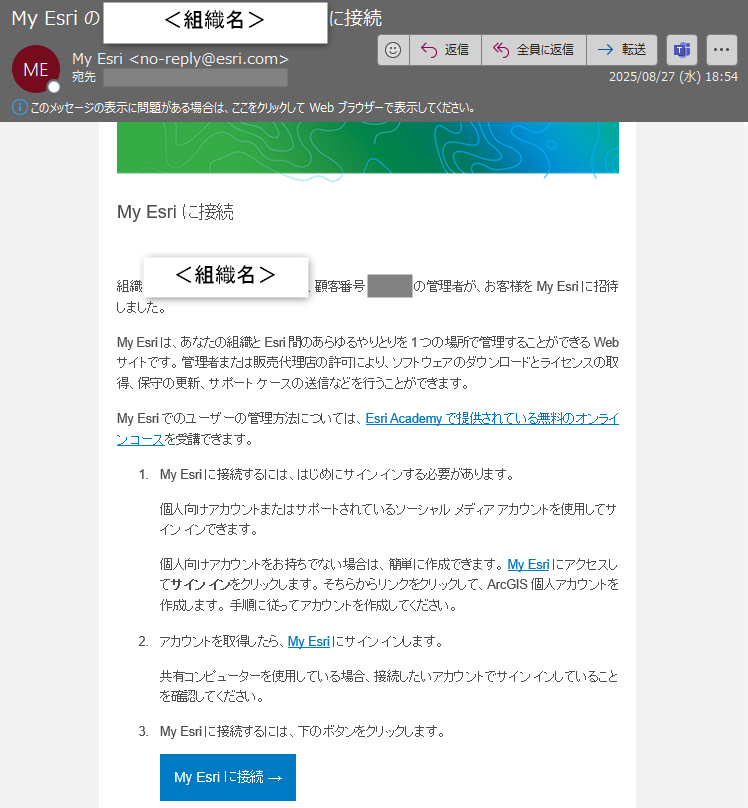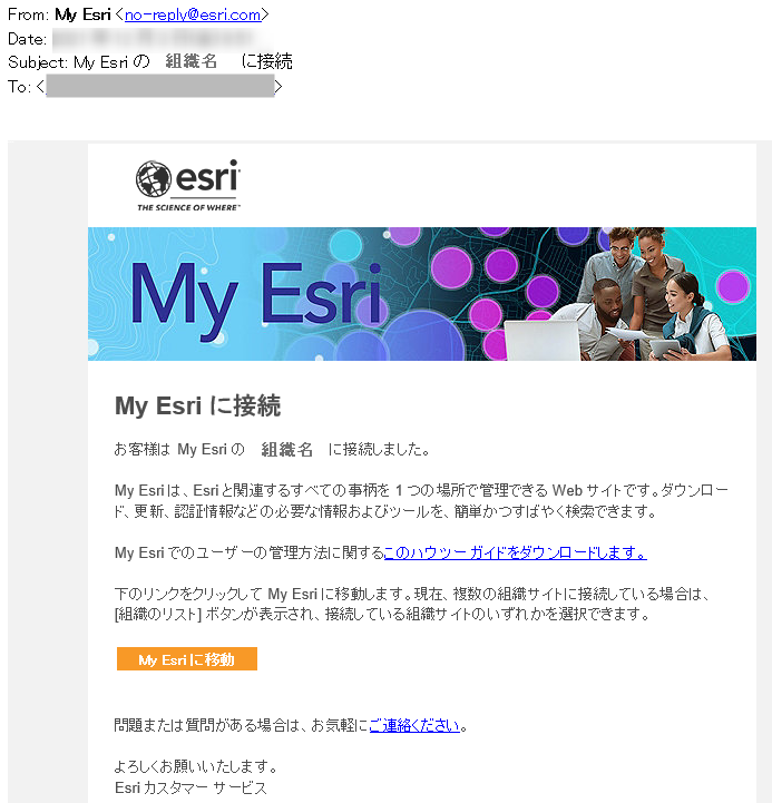 - 時間を置いて、My Esri <no-reply@esri.com> から件名:「My Esri の <組織名>に接続」というメールを受信しますと、アカウントの組織への接続が完了しています。