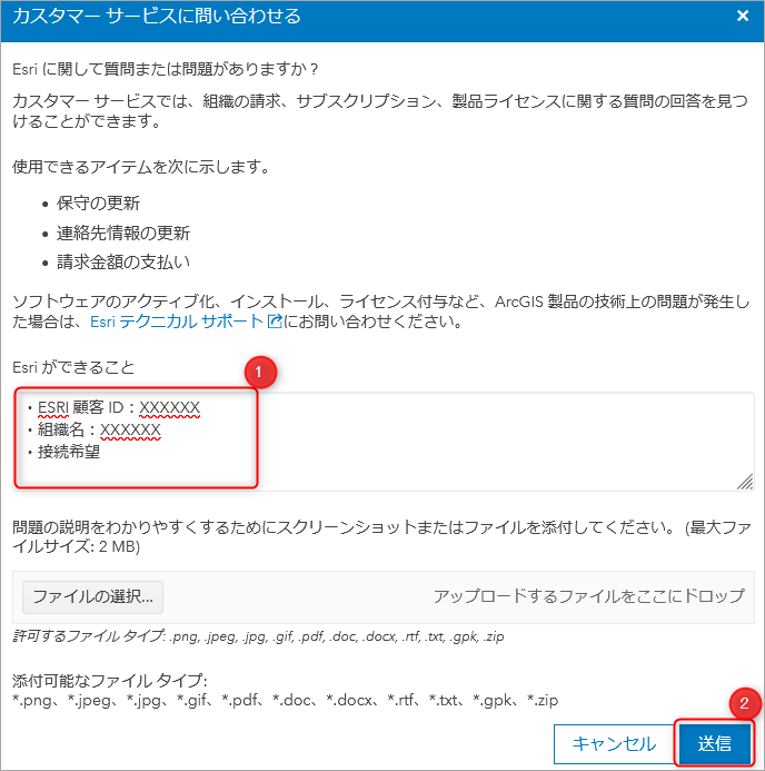 コメント欄に ESRI顧客ID、組織名