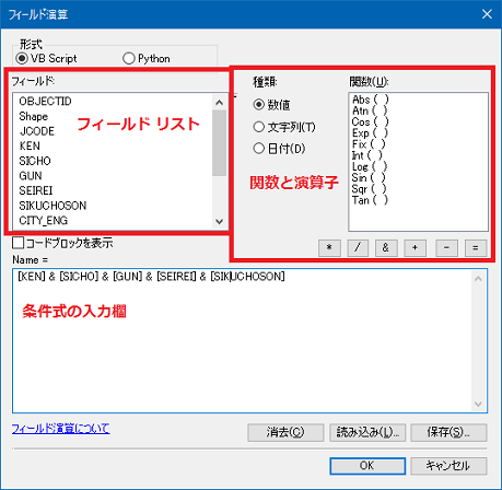 "東京都" & " " & [FID] - [OK] をクリックし、フィールド演算のダイアログを閉じます