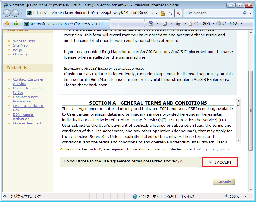 - ライセンスの契約条件を読み、同意した場合は画面の最下部にある I ACCEPT にチェックを入れ、[Submit] をクリックします。