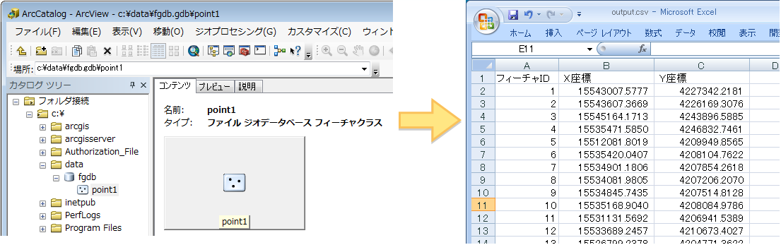 ジオデータベースのポイント フィーチャクラスに格納されているすべてのフィーチャについて、フィーチャ ID、X 座標、Y 座標を csv ファイルに出力するサンプル コードです。