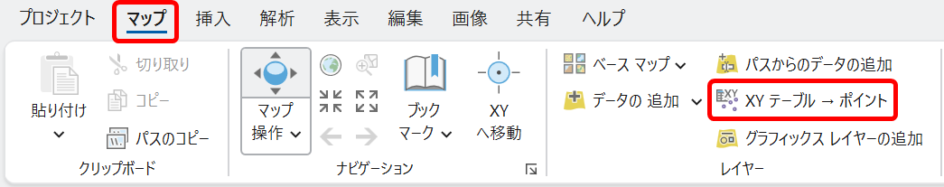 [マップ] タブ → [レイヤー] グループ → [XY テーブル → ポイント] をクリックします。
