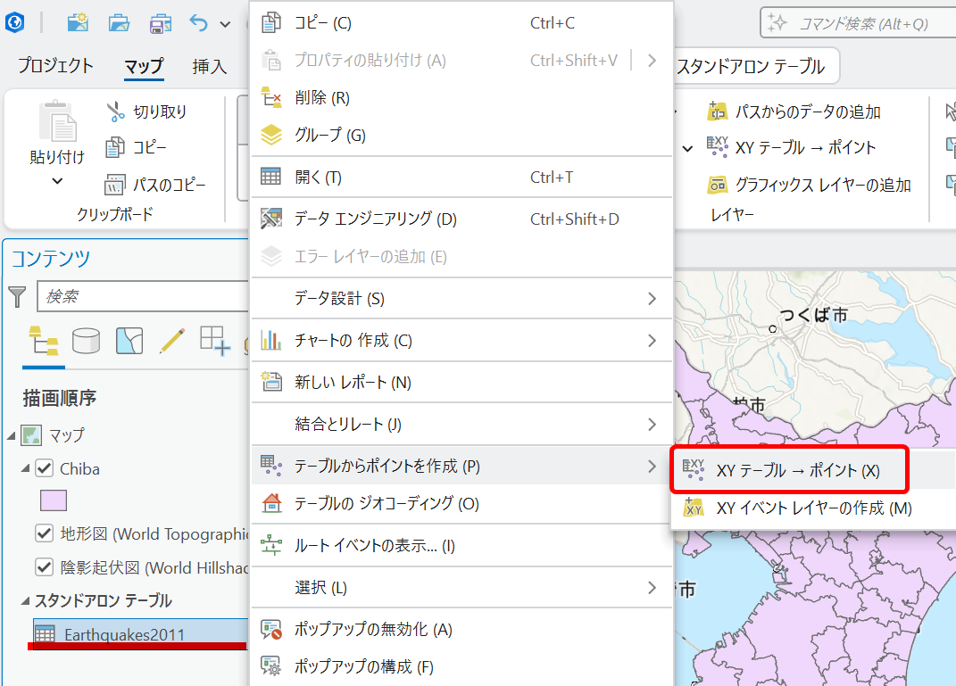 [コンテンツ] ウィンドウに追加されたテーブルを右クリック → [テーブルからポイントを作成] → [XY テーブル → ポイント] をクリックします。