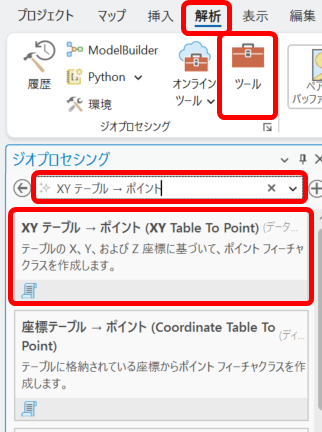 [ジオプロセシング] ウィンドウ上部にある [ツールの検索] で 「XY テーブル → ポイント」と入力し、検索します。方法 2