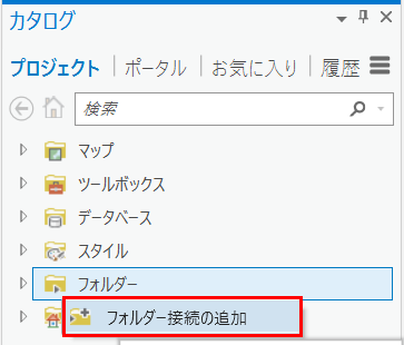 - [カタログ] ウィンドウの [プロジェクト] にて、[フォルダー] を右クリックしてメニューを開き、[フォルダー接続の追加] をクリックします。