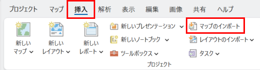 - ArcGIS Pro の [挿入] タブ → [マップのインポート] をクリックします。