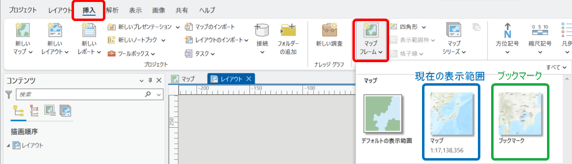 [挿入] タブ → [マップ フレーム] のドロップダウンをクリックします。