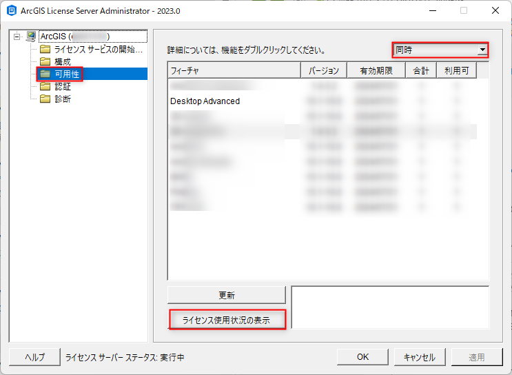 - ライセンス マネージャー(ArcGIS License Server Administrator)を起動したあと、画面左側にある [利用可能ライセンス] または [可用性] を選択して、(※画面右上を [指定ユーザ] から [同時] に変更したあと)画面右下にある [ライセンス使用状況の表示] を選択します。
