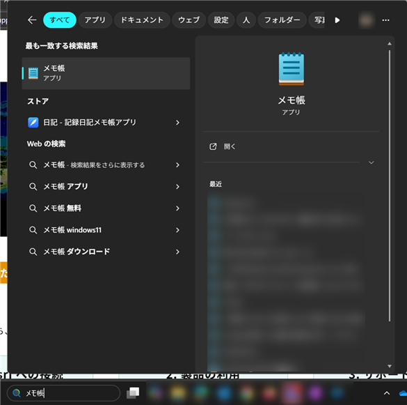 - Windows の検索バーにて、「メモ帳」と検索し、[メモ帳] をクリックします。