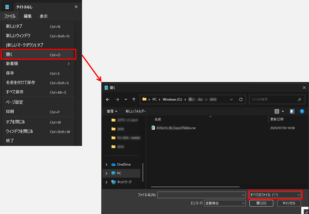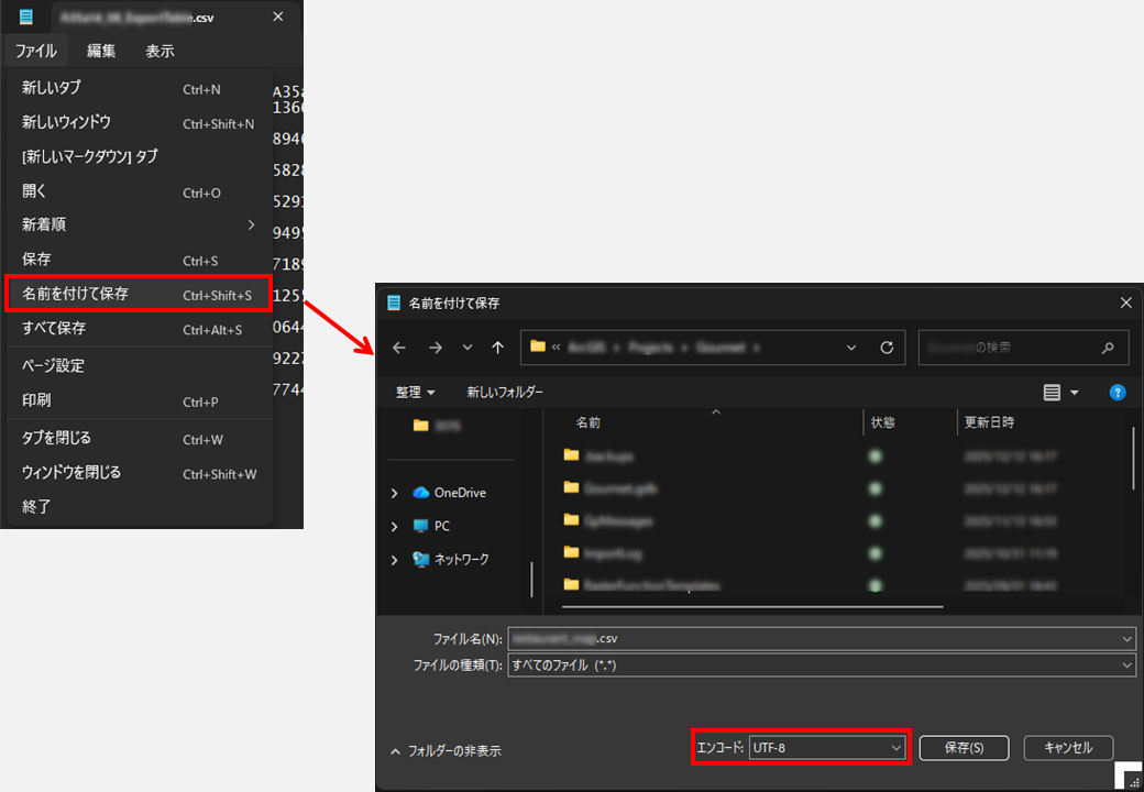 ※ [ファイル名] 欄の右側にあるドロップダウン リストにて [すべてのファイル] を選択すると、CSV ファイルが表示されます。 - [ファイル] メニュー → [名前を付けて保存] を選択します。表示された [名前を付けて保存] ダイアログにて、保存場所とファイル名を適宜入力し、[エンコード] のドロップダウン リストにて [UTF-8] を選択し、[保存] ボタンをクリックします。ファイル名の最後に ".csv" が入力されていないと、CSV ファイルとして保存されないためご注意ください。