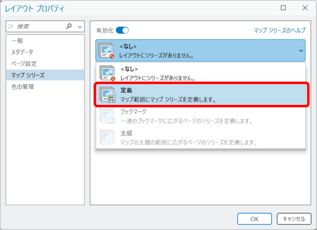 - 表示される [レイアウト プロパティ] ダイアログの [マップ シリーズ] で、[定義] を選択します。