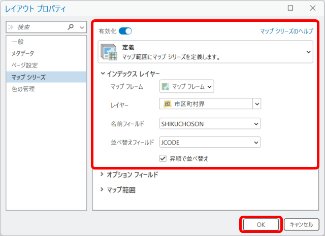 [名前フィールド] でマップ シリーズの名称に使うフィールド名、 [並べ替えフィールド] でページの並べ替えに使うフィールド名を指定します。