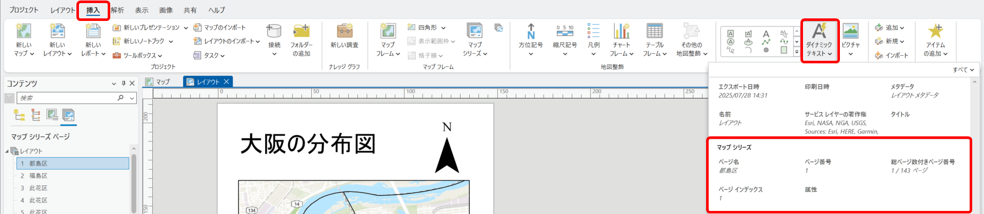 [挿入] タブ → [ダイナミック テキスト] をクリックし、[マップ シリーズ] のリストから「ページ名」や「ページ番号」、「総ページ付きページ番号」をクリックし、レイアウトに配置します。