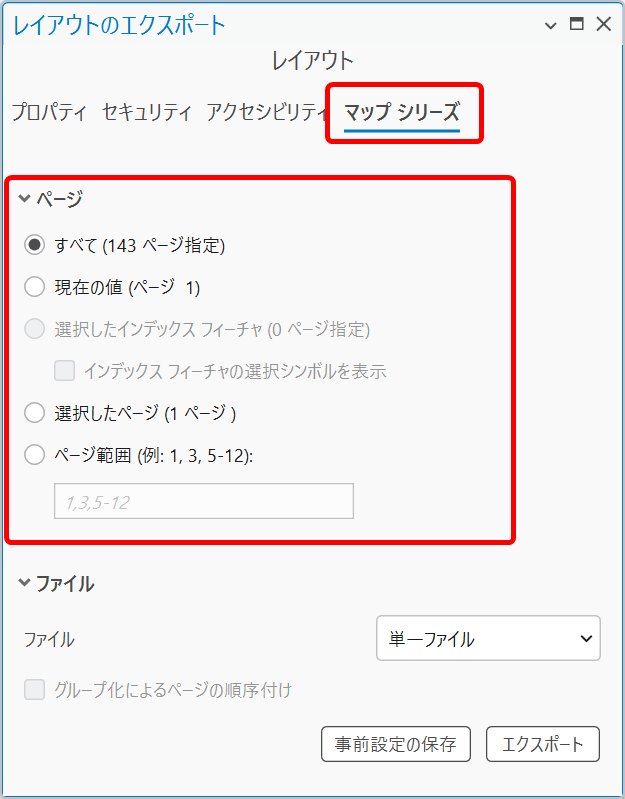 - 表示される [レイアウトのエクスポート] ダイアログで、 [マップ シリーズ] タブを表示します。