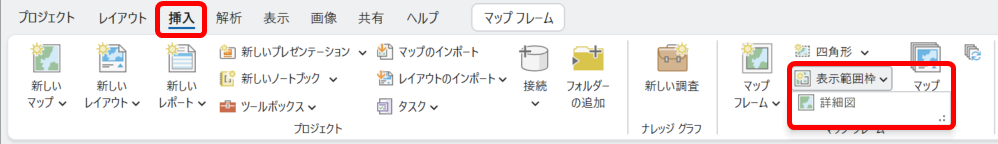 マップ フレーム:[挿入] タブ → [マップ フレーム] のドロップダウンをクリックします。
