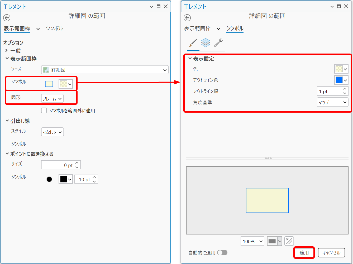 枠のスタイルを変更する場合は、シンボルの設定で変更し、最後に [適用] をクリックします。