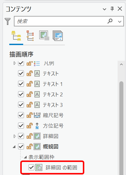表示範囲枠の表示対象となるマップ フレーム (概観図 マップ フレーム) を選択し、[挿入] タブ → [表示範囲枠] から、レイアウト上の別のマップ フレーム (詳細図 マップ フレーム) を選択します。