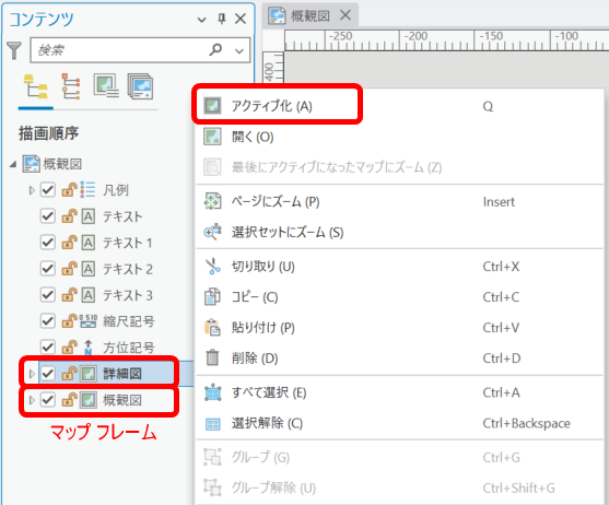 レイアウト上で対象のマップ フレームを選択し、右クリック → [アクティブ化] をクリックして調整します。