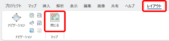 [レイアウト] タブの [閉じる] をクリックすると、アクティブ化されているマップ フレームを閉じることができます。