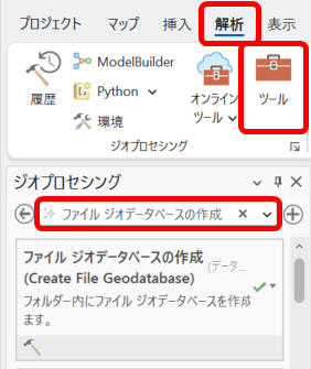 - [ジオプロセシング] ウィンドウの [ツールの検索] 欄で、「ファイル ジオデータベースの作成」を検索します。