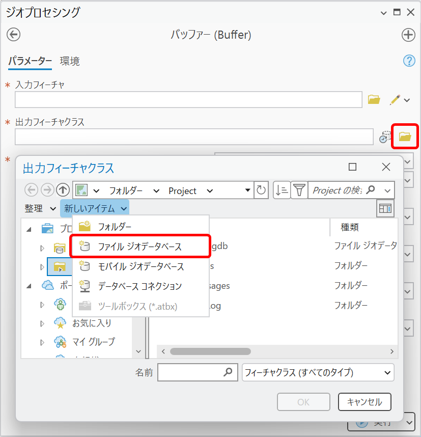 - [新しいアイテム] → [ファイル ジオデータベース] を選択し、フォルダー名を入力します。