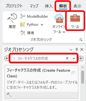 - [ジオプロセシング] ウィンドウの [ツールの検索] 欄で、「フィーチャクラスの作成」を検索します。