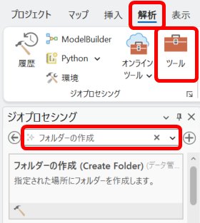 - [ジオプロセシング] ウィンドウの [ツールの検索] 欄で、「フォルダーの作成」を検索します。