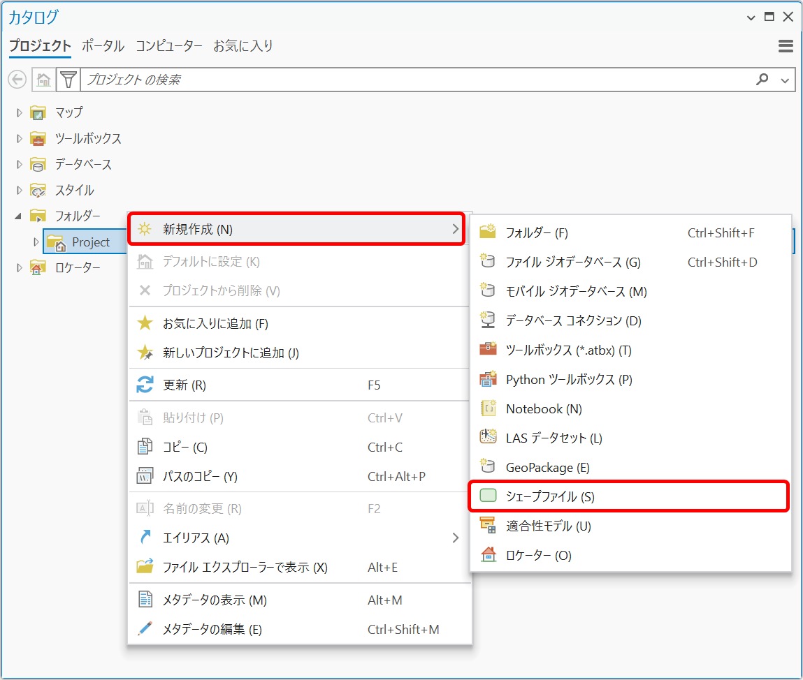 - [カタログ] ウィンドウで新規シェープファイルを格納したい、既存のフォルダーを右クリックします。