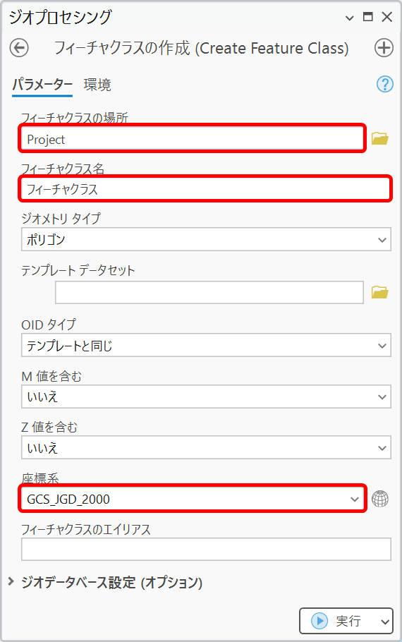 - [フィーチャクラス名]:作成するフィーチャクラスの名前を入力します