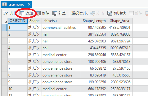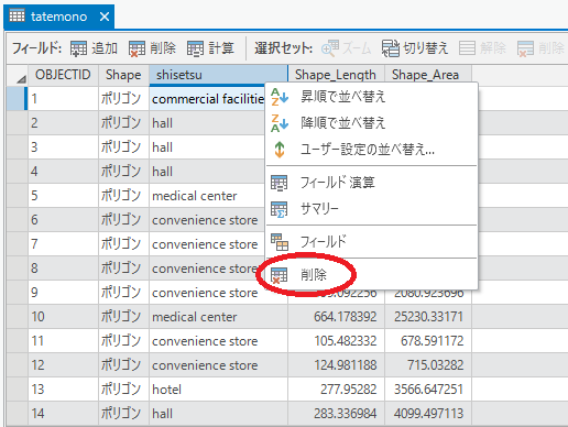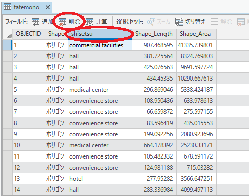 または、削除したいフィールド名をクリックし選択状態にした後、属性テーブル上部にある [削除] をクリックします。- 属性テーブル上部にある [追加] をクリックします。
