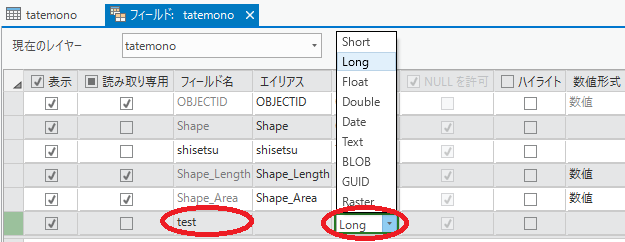 [フィールドタイプ]:[Short]、[Long]、[Double...] 等を選択してください。