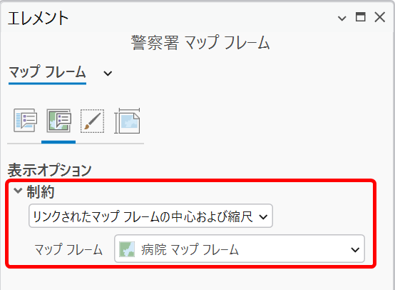 警察署を表示するマップ フレームに対して、病院のマップ フレームと同じ中心位置と縮尺で表示するように設定します。
