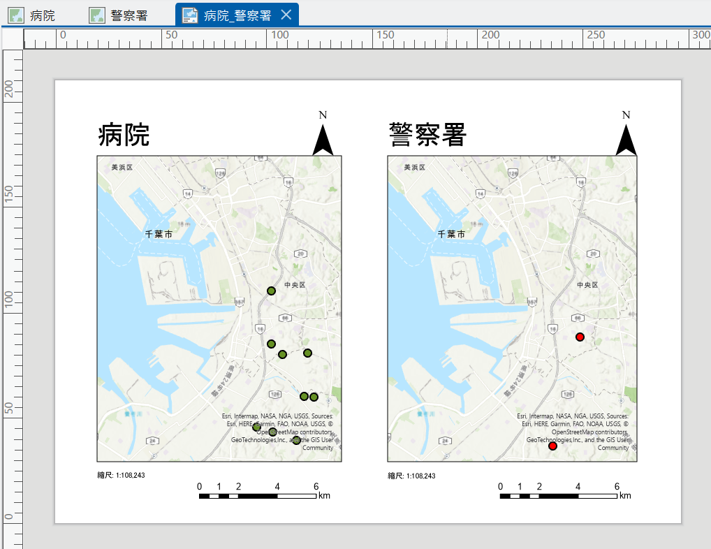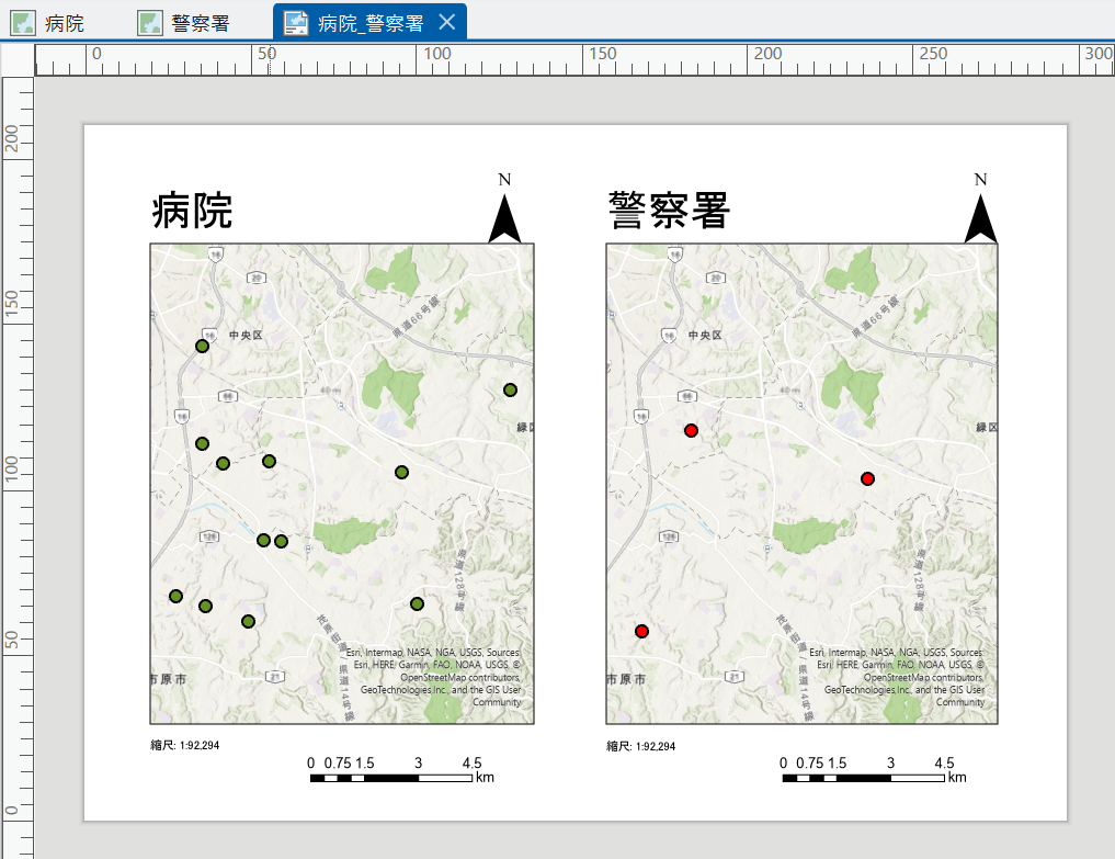 例として、病院と警察署の所在地を表した 2 つのレイヤーからマップ フレームをそれぞれ用意して手順をご紹介します。