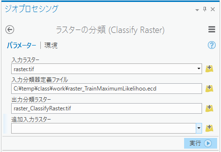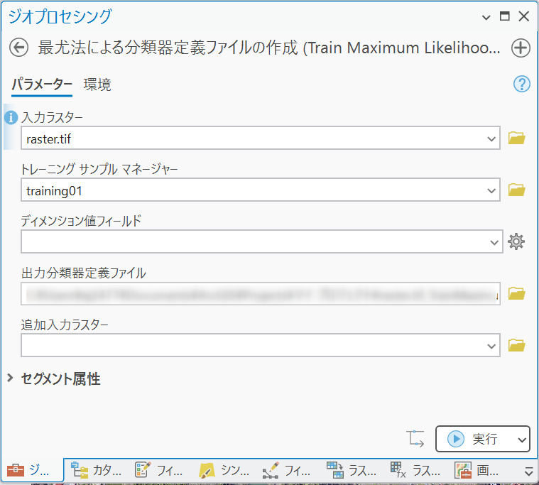 ・[出力分類器定義ファイル]:出力するファイル名 - [ラスターの分類] ツールで定義ファイルをもとに教師付き分類を行います。
