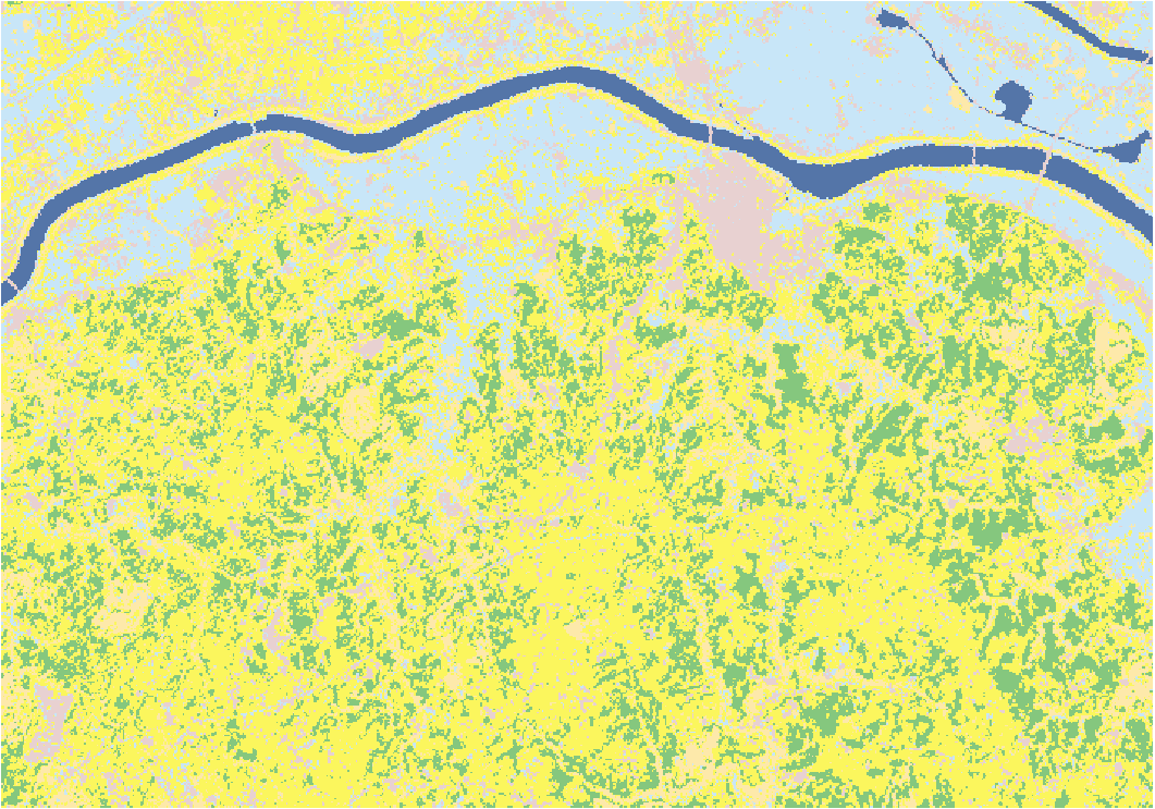 教師付き分類では、あらかじめ分類するクラスを表すピクセル(トレーニング サンプル)をラスターから取得し、それにもとづいて残りのピクセルを分類します。人間が画像を目視判読し、対象となる土地被覆の領域のピクセルをトレーニング サンプルとして取得しますので、目視判読に近い分類図を得ることができます。