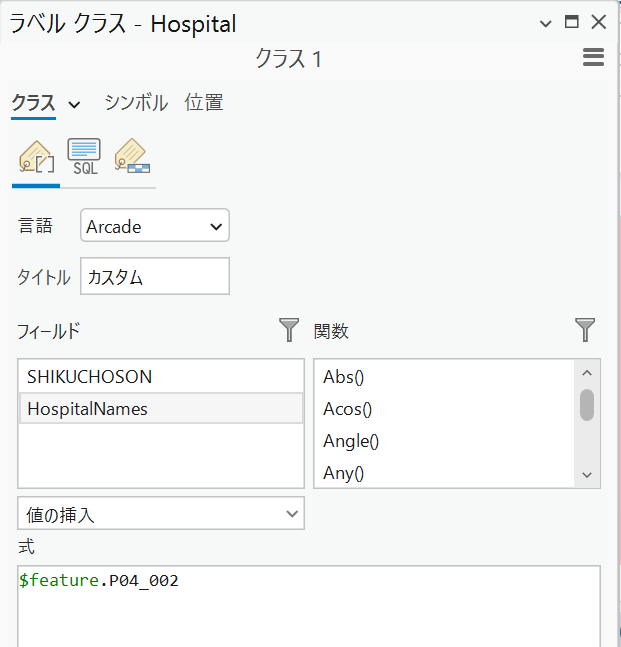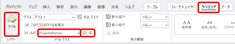 2. [ラベル] ボタンをクリックし、[フィールド] で表示対象のフィールド (HospitalNames) を選択します。