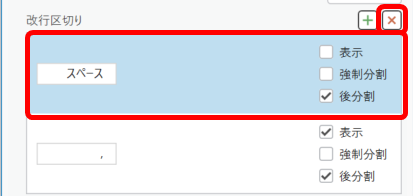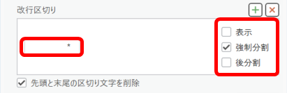 8. [改行区切り] のテキストボックスで 「* (アスタリスク)」を入力し、[表示] のチェックをオフ、[強制分割] にチェックを入れます。