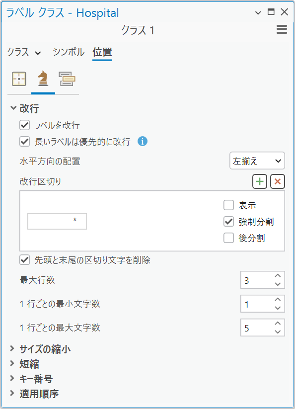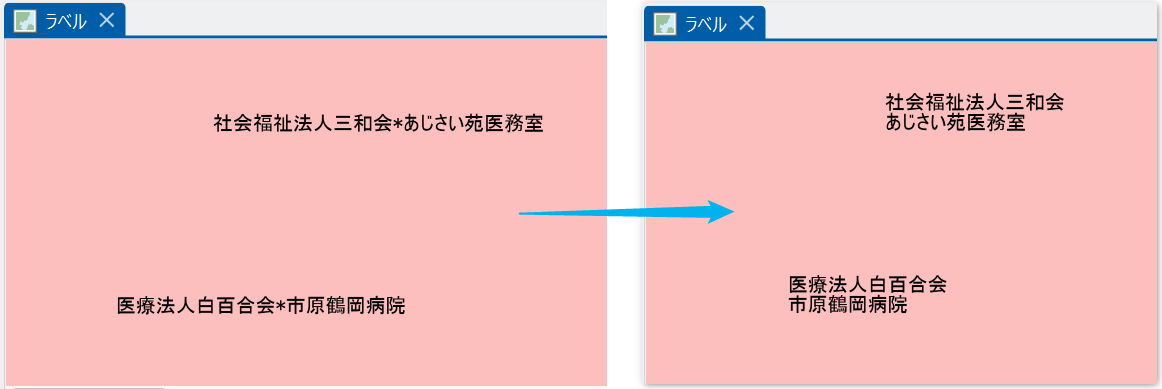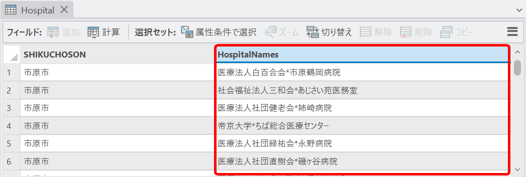 ここでは、下図の「HospitalNames」フィールドの値をアスタリスク (*) の位置で改行したラベルを表示する手順についてご紹介します。