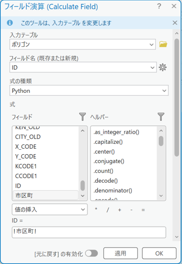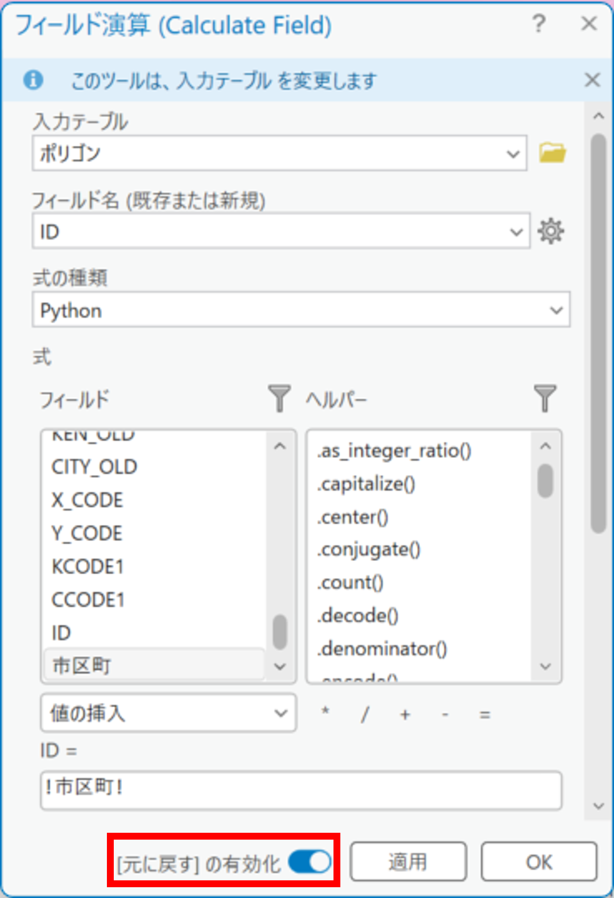 - デフォルトでは、フィールド演算の処理を行った後は、処理を行う前の状態に戻すことはできません。元に戻したい場合は、[[元に戻す] の有効化] オプションをオンにして実行してください。
