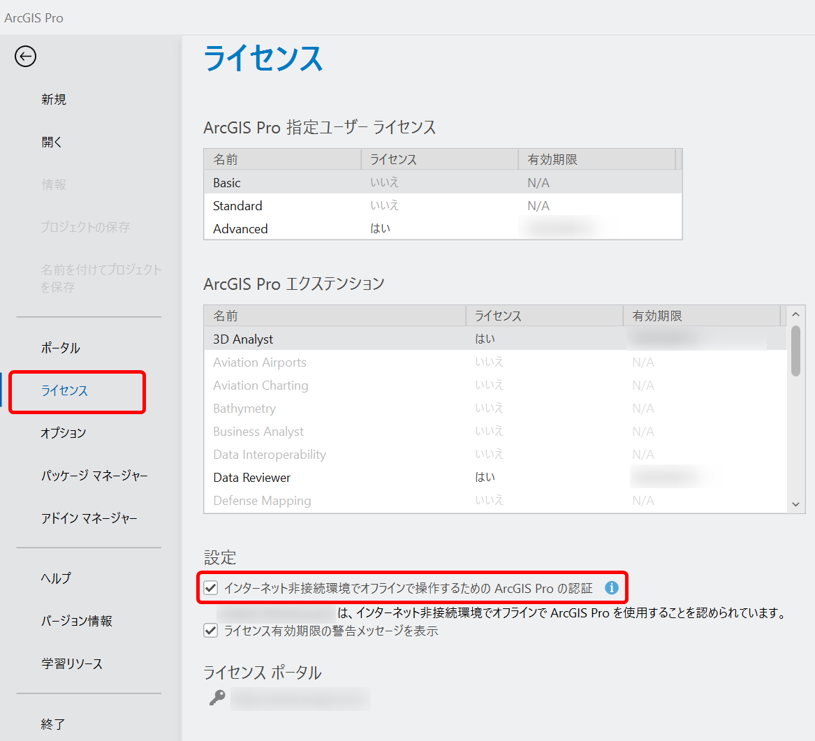 すでにプロジェクト (マップなど) を開いている場合は、[プロジェクト] タブをクリックします。 - [ライセンス] をクリックし、[インターネット非接続環境でオフラインで操作するための ArcGIS Pro の認証] のチェックを外し、オフライン設定を解除します。