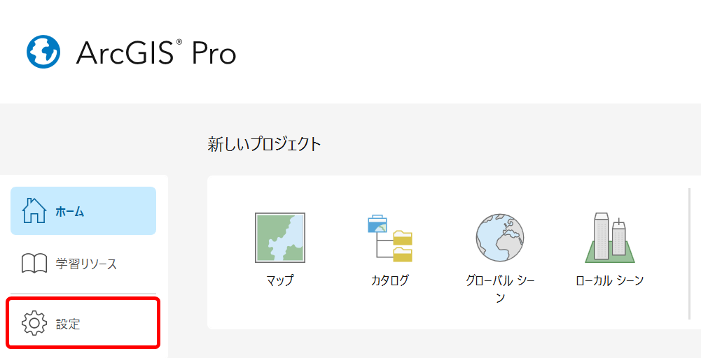 - ArcGIS Pro を起動し、[設定] をクリックします。