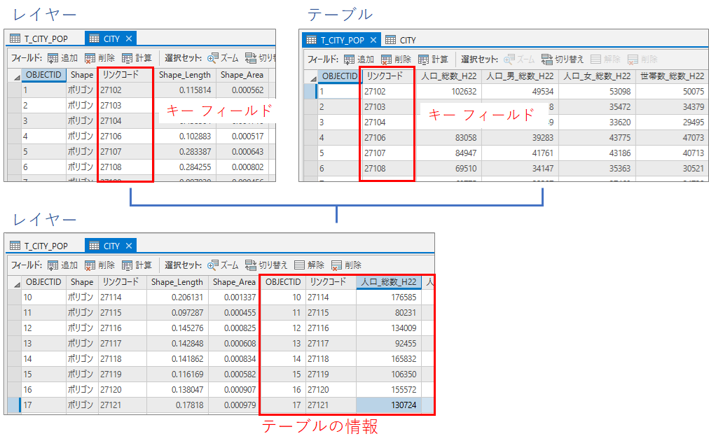 フィーチャ レイヤーと他のテーブルで共通の値をとるフィールドがある場合、フィーチャからテーブルの情報を参照できるように関連付ける操作を行うことができます。ここでは、それぞれのレコードを1 対 1で関連付けるテーブル結合の方法について説明します。