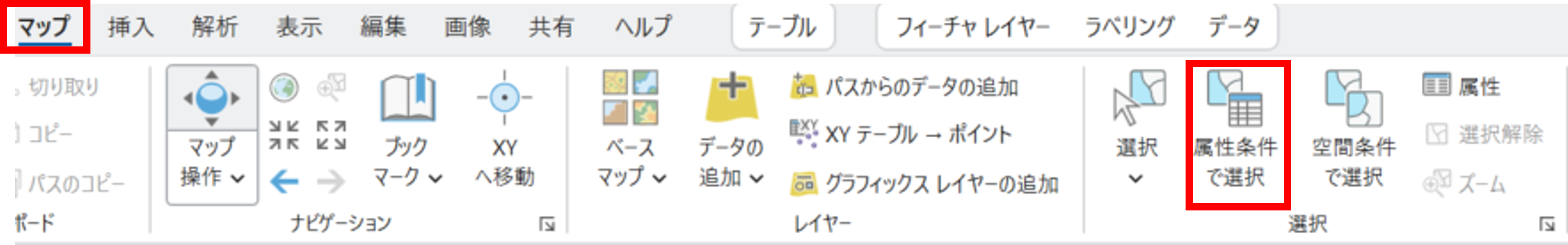 - [マップ] タブ → [属性条件で選択] をクリックします。