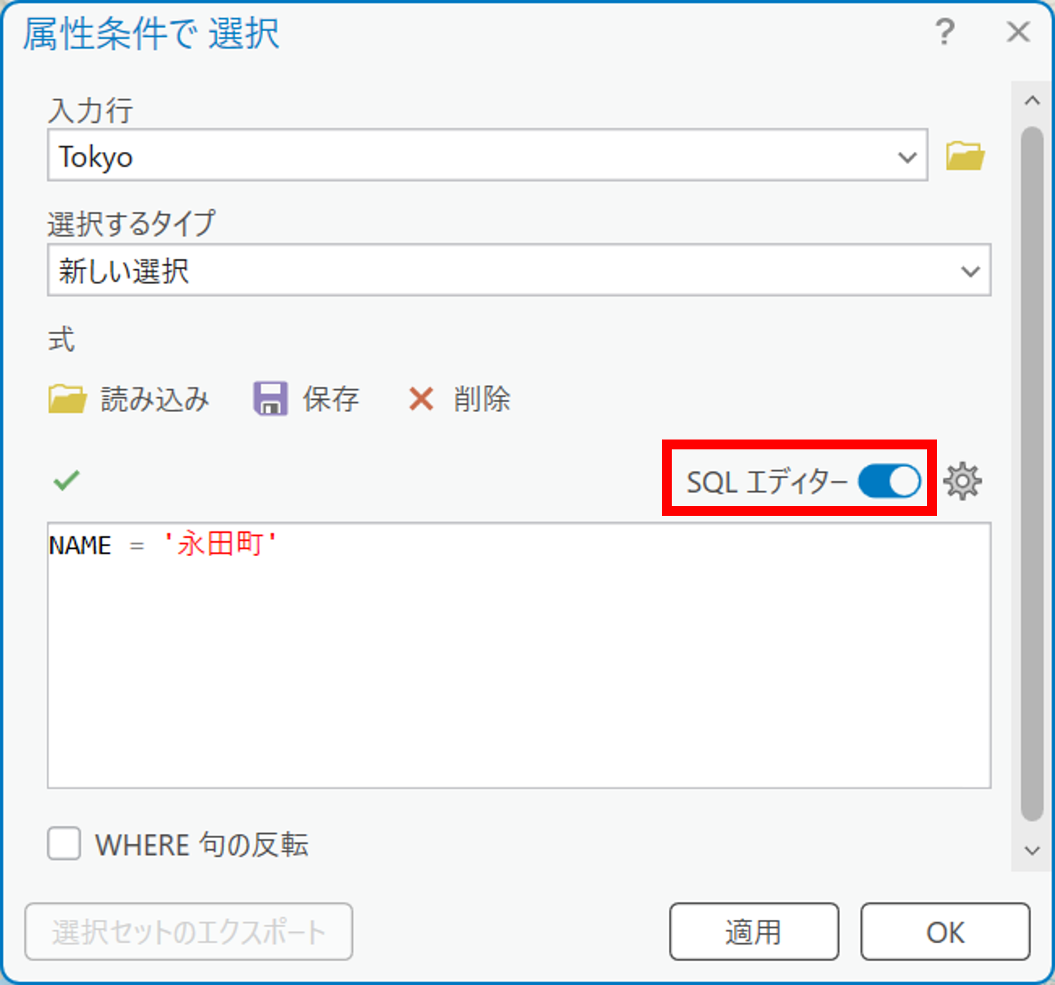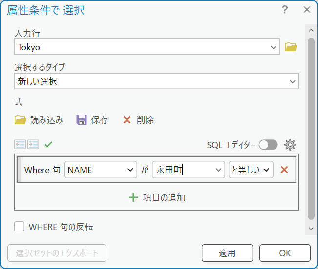 ※ それぞれの選択するタイプの詳細につきましては、「属性検索 (Select Layer By Attribute) (データ管理)」をご覧ください。 - 次のいずれかの方法で選択条件式を設定します (例:「NAME」フィールドにある「永田町」という属性値を選択)。 ●Where 句を設定する場合