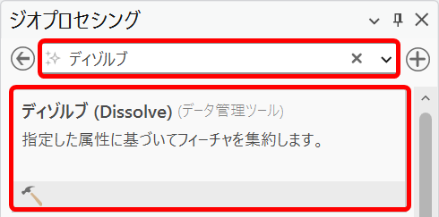 - [ジオプロセシング] ウィンドウのツールの検索欄に「ディゾルブ」と入力します。