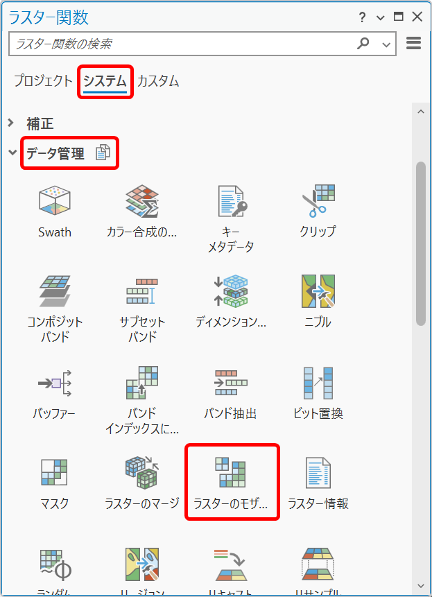 2. [ラスター関数] ウィンドウにて [システム] → [データ管理] → [ラスターのモザイク] をクリックします。