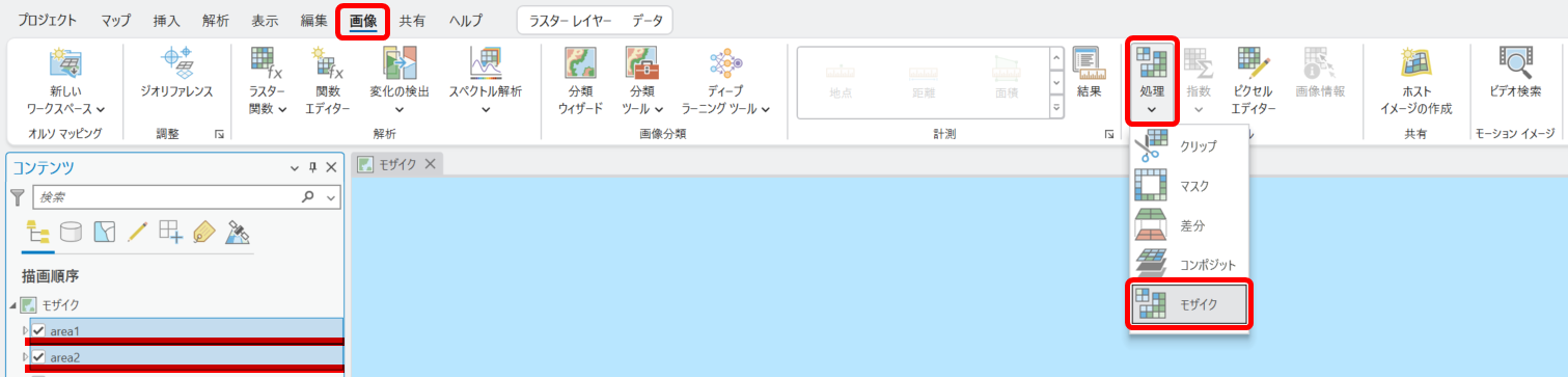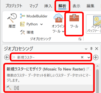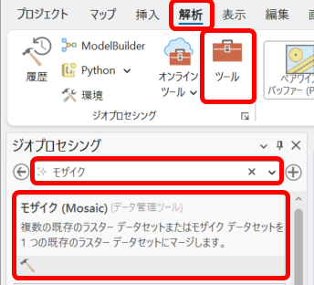 ・[解析] タブ → [ツール] → [ジオプロセシング] ウィンドウ上部にある [ツールの検索] で「モザイク」と検索し、[モザイク] ツールをクリックします。