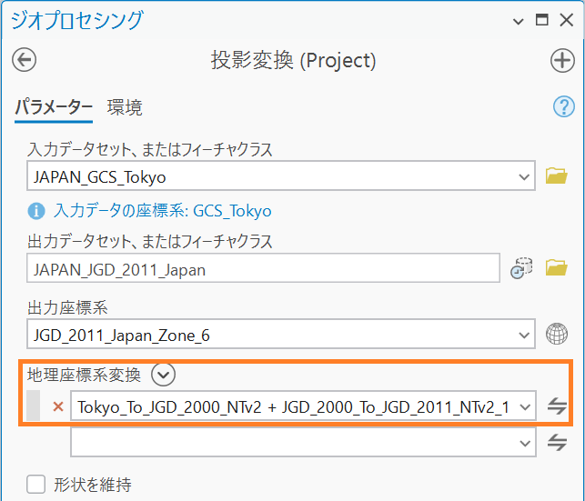 また、[地理座標系変換] を設定することで、測地基準系の変更を行うことができます。ここでは、地理座標系 (日本測地系) のデータを、平面直角座標系 第 6 系 (日本測地系 2011) のデータに変更する手順を説明します。